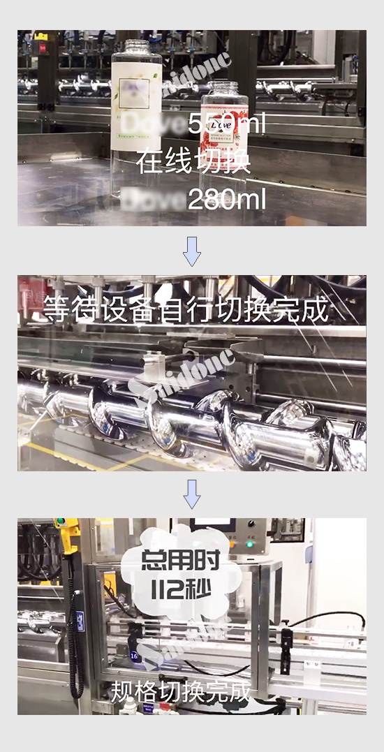 “哄~~~~~哄~~~~~~~~~”***華的沐浴露灌裝車間里,幾聲輕巧的按鈕聲后,伴隨著低聲的隆隆聲,剛才還在高速生產(chǎn)狀態(tài)的全自動灌裝機(jī)停止了灌裝。隨即螺桿、灌裝頭、護(hù)欄開始調(diào)整就位,過程平穩(wěn)流暢。112秒!隨著調(diào)整到位,生產(chǎn)開始按鈕按下,新的灌裝指令發(fā)出,灌裝機(jī)立即進(jìn)入下一個規(guī)格產(chǎn)品的高速灌裝。從550ml到280ml更換規(guī)格灌裝,全部調(diào)整完成不足2分鐘,產(chǎn)品規(guī)格的更換幾乎無縫銜接。這,是否是你向往已久的灌裝生產(chǎn)模式?