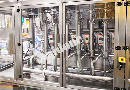 高速行進(jìn)中的螺桿,沿著精心設(shè)計的弧度順滑地旋轉(zhuǎn)著,十分貼合推進(jìn)著瓶身,閃耀著銀白色耀眼的光芒。灌裝頭組件在伺服驅(qū)動下,平穩(wěn)準(zhǔn)確地追蹤著瓶子,在高速行進(jìn)中完成灌裝。繼而快速回移就位,準(zhǔn)備進(jìn)入下一輪的灌裝。